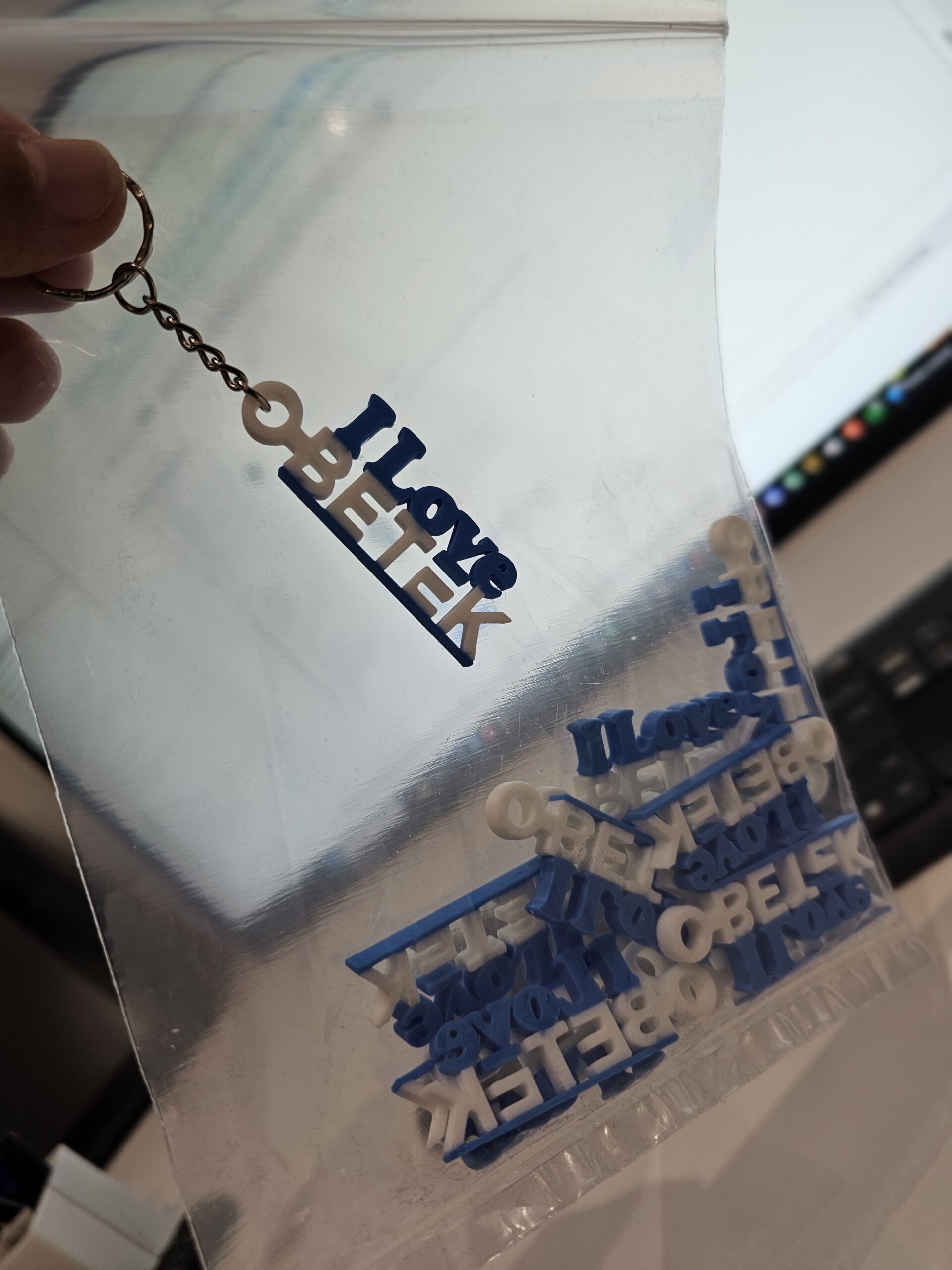 En complément, une petite série de porte-clés en caoutchouc (TPU) imprimés en 3D en express pour l’anniversaire évènement de l’entreprise.